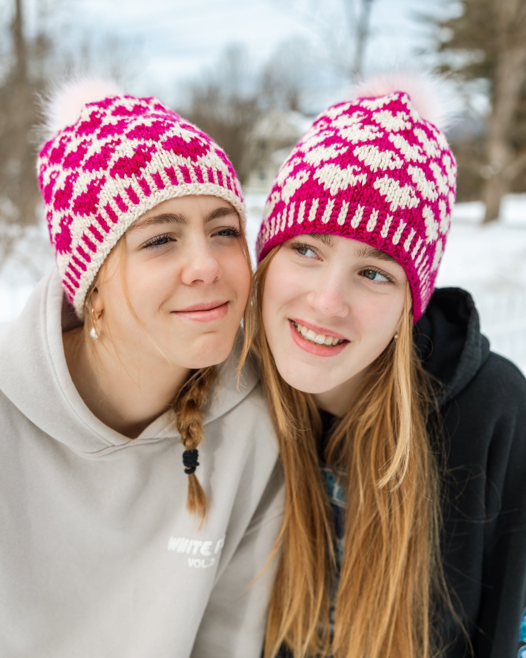 Knit not one but TWO joyful heart hats, for you and a pal this Valentine's Day. The kit includes enough yarn for two hats, when you invert the colors.